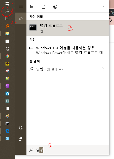 - 작업 표시줄 돋보기 아이콘 클릭 + '명령' 키워드 작성 + 클릭