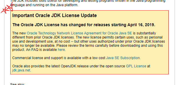 | Important Oracle JDK License Update The Oracle JDK License has changed for releases starting April 16, 2019. The new Oracle Technology Network License Agreement for Oracle Java SE is substantially different from prior Oracle JDK licenses. The new license permits certain uses, such as personal use and development use, at no cost -- but other uses authorized under prior Oracle JDK licenses may no longer be available. Please review the terms carefully before downloading and using this product. An FAQ is available here. Commercial license and support is available with a low cost Java SE Subscription. Oracle also provides the latest OpenJDK release under the open source GPL License at jdk.java.net. |