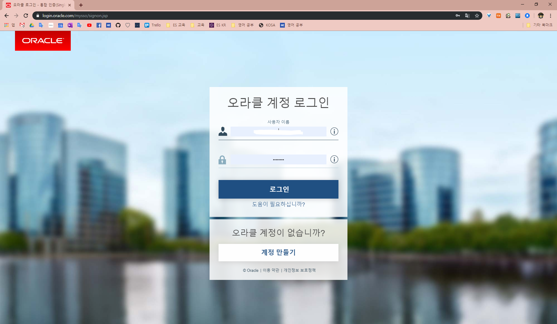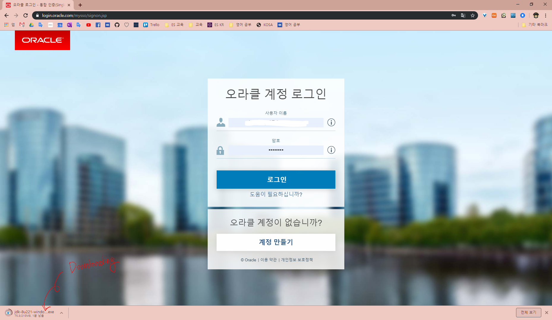 오라클 계정이 필수라 계정이 없다면 '계정 만들기' 클릭해서 계정을 만들고 로그인까지 하셔야합니다.(이메일 주소말고는 다 대충 작성하셔도 됩니다)