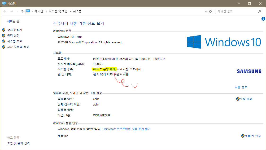 확인해보면 저는 Windows OS에 64bit 운영 체제를 가졌네요.