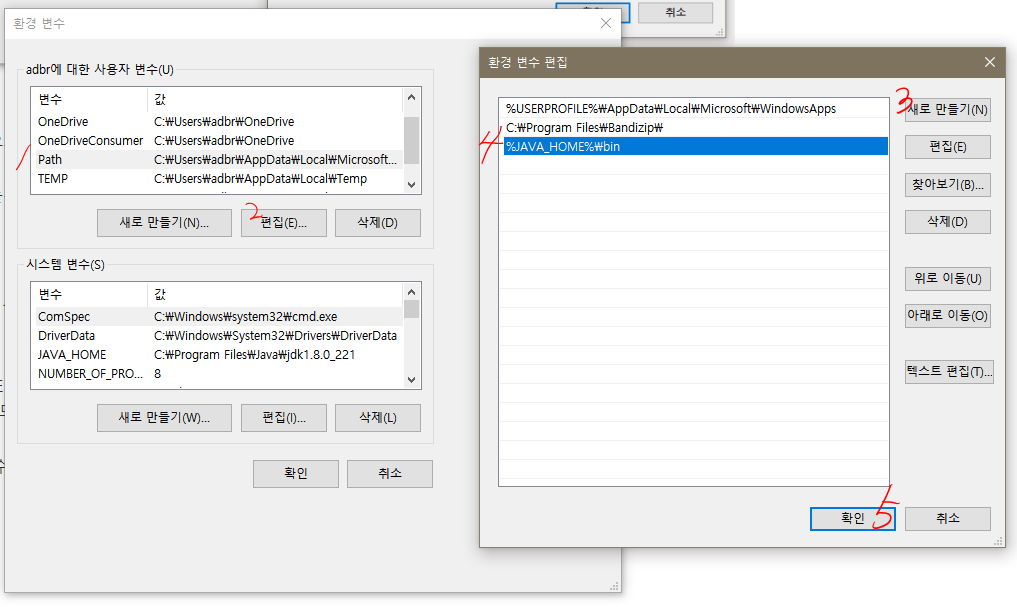 다른 OS이신 분들은 Path의 편집들어가셔서 ;추가하고 뒤에 '%JAVA_HOME%\bin' 을 추가해주세요.