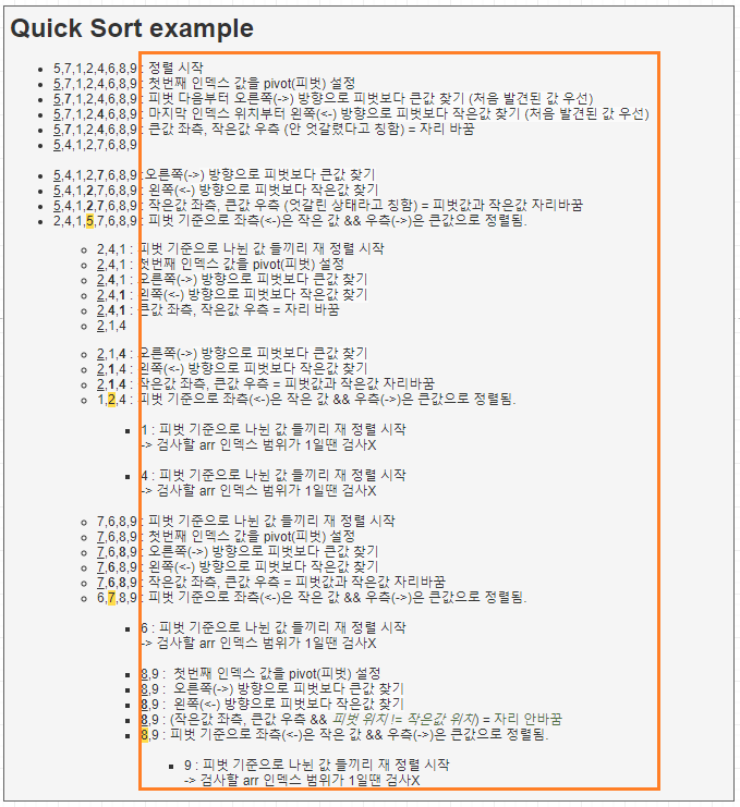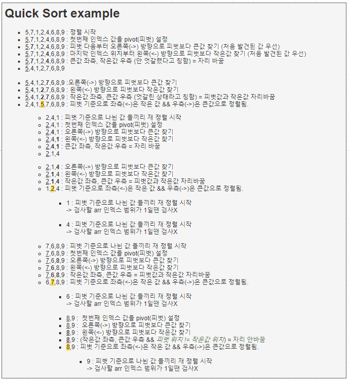 곧바로 피벗 기준으로 좌측(<-)은 피벗보다 작은값들로 우측(->)은 큰값들로 구분되죠?
